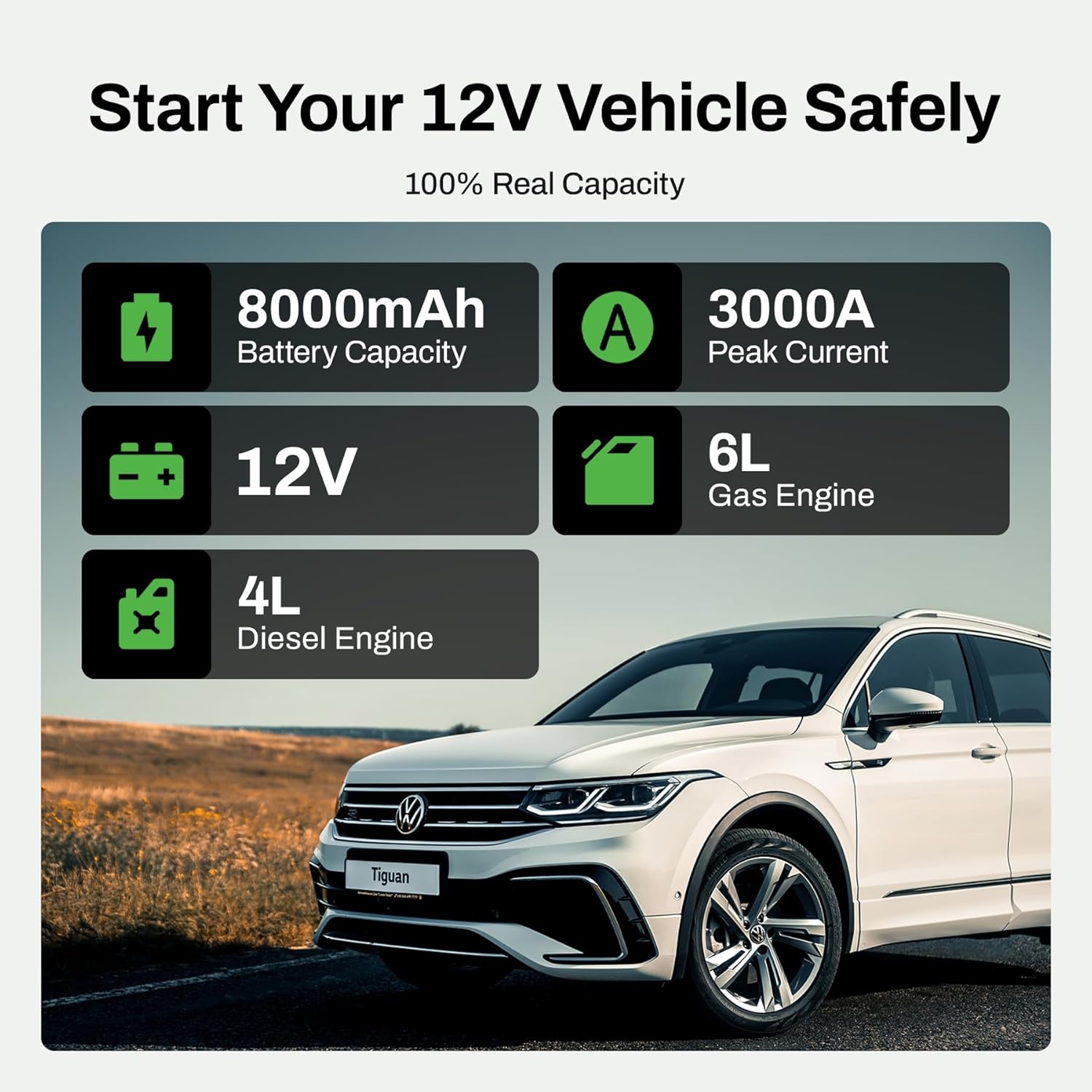 12V Battery Jump Starter 3000A, Portable, Up to 6.0L Gasoline & 4.0L Diesel Engines