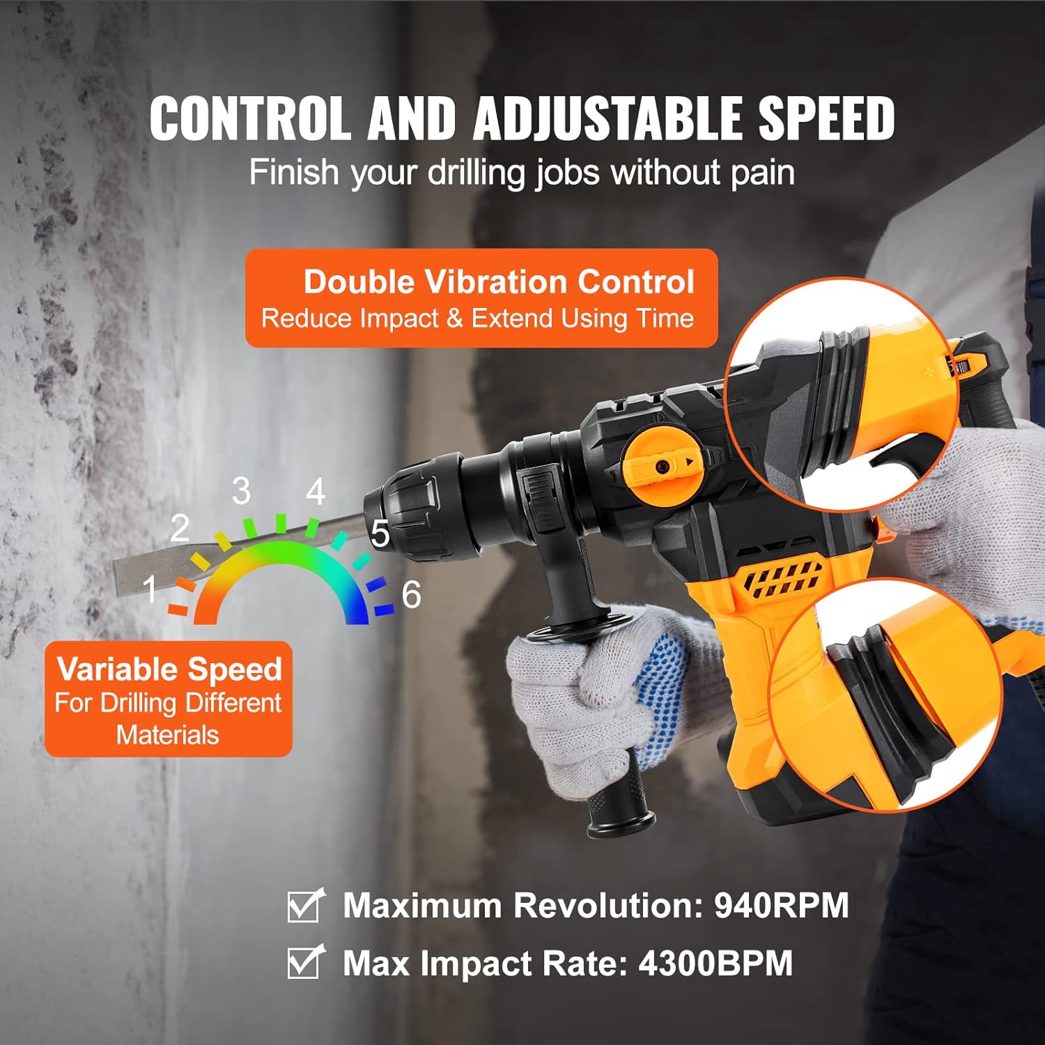 1-1/4 In 13 Amp SDS-Plus Rotary Hammer Corded Drill, w/Vibration Control & Safety Clutch, Variable Speed, For Concret
